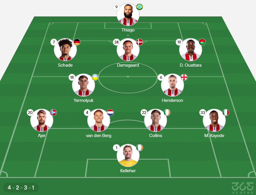 - Provável escalação do Brentford: Kelleher; M. Kayode, Collins, Sepp Van den Berg e Ajer; Herderson e Yarmolyuk; Damsgaard, Schade e D. Ouattara; Igor Thiago.