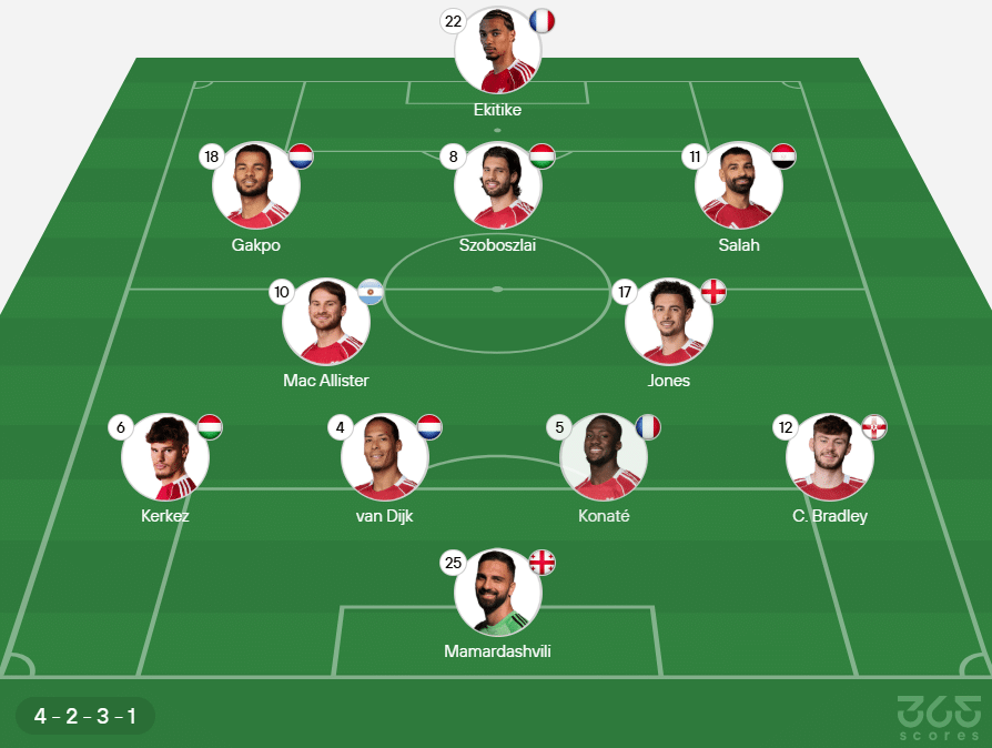 Provável escalação do Liverpool: Mamardashvilli; Conor Bradley, Konate, Virgil van Dijk e Kerkez; Curtis Jones e Mac Allister; Szoboszlai, Gakpo e Salah; Hugo Ekitike.