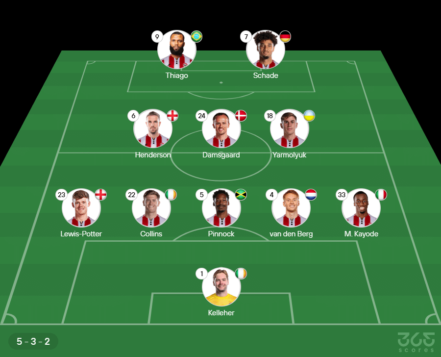 Provável escalação do Brentford: Kelleher, Lewis-Potter, Collins, Pinnock, van den Berg e Kayode; Henderson, Damsgaard e Yarmolyuk; Igor Thiago e Schade. Técnico: Keith Andrews.