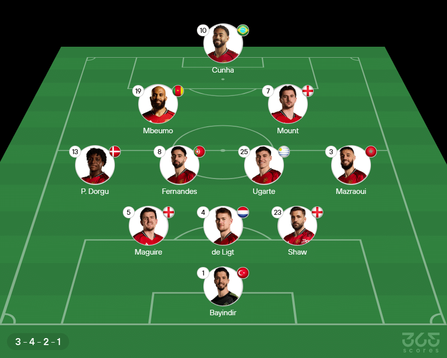 Provável escalação do Manchester United: Bayindir, Maguire, de Ligt e Luke Shaw; Patrick Dorgu, Bruno Fernandes, Ugarte e Mazraoui; Mbeumo, Mason Mount e Matheus Cunha. Técnico: Rúben Amorim.
