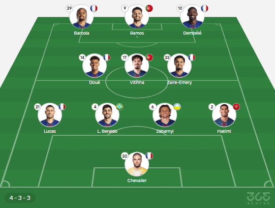 Provável escalação do PSG: Chevalier, Hakimi, Zabarnyi, Beraldo, Hernández; Vitinha, Zaïre-Emery, Doué, Dembelé, Barcola, Ramos. Técnico: Luis Enrique