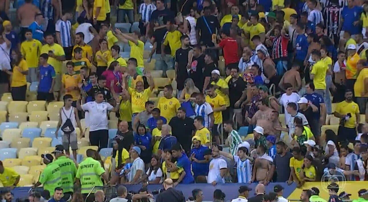 O clássico entre Brasil e Argentina corre o risco de não acontecer. No momento da execução dos hinos nacionais, torcedores entraram em conflito no setor sul das arquibancadas. A polícia precisou intervir e jogadores também.