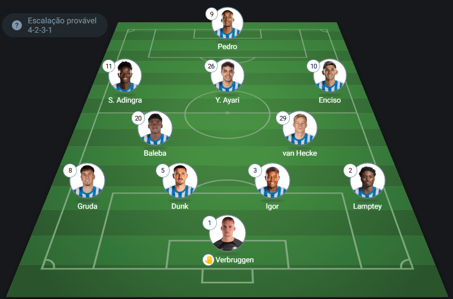 - Provável escalação do Brighton: Verbruggen, Gruda, Dunk, Igor e Lamptey; Baleba, van Hecke, Adingra, Ayari e Enciso; João Pedro