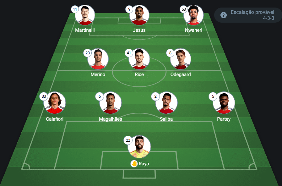 - Provável escalação do Arsenal: Raya, Calafiori, Gabriel Magalhães, Saliba e Thomas Partey; Mikel Merino, Declan Rice e Martin Odegaard; Gabriel Martinelli, Nwaneri e Gabriel Jesus