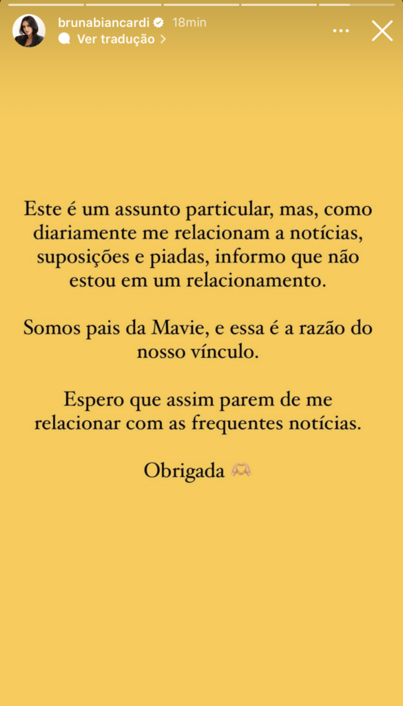 “Este é um assunto particular, mas, como diariamente me relacionam a notícias, suposições e piadas, informo que não estou em um relacionamento. Somos pais da Mavie, e essa é a razão do nosso vínculo. Espero que assim parem de me relacionar com as frequentes notícias. Obrigada”, escreveu.