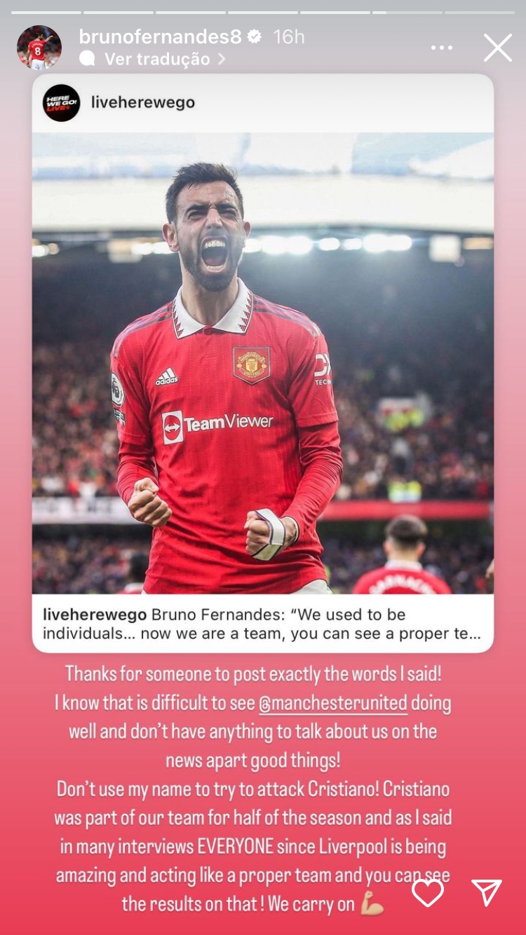 Após a vitória por 2 a 1 no Old Trafford contra o Manchester City, Bruno Fernandes, um dos autores dos gols do Manchester United, exaltou a coletividade da equipe e alguns jornalistas e torcedores interpretaram como uma indireta a Cristiano Ronaldo. Em suas redes sociais, o português negou a intenção.