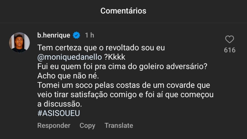 “Tem certeza que o revoltado sou eu? Fui eu quem foi pra cima do goleiro adversário? Acho que não né. Tomei um soco pelas costas de um covarde que veio tirar satisfação comigo e foi aí que começou a discussão. #AISESOUEU””, escreveu Bruno Henrique.