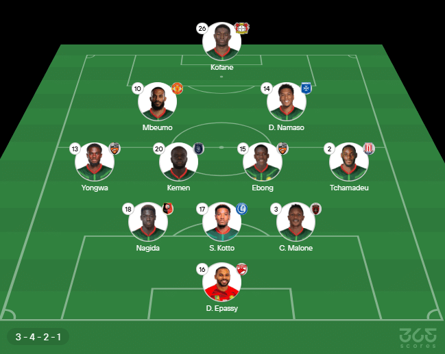 - Escalação de Camarões: Epassy, Malone, Kotto e Nagida; Tchamadeu, Ebong, Kemen e Yongwa; Namasso, Bryan Mbeumo e Kofane