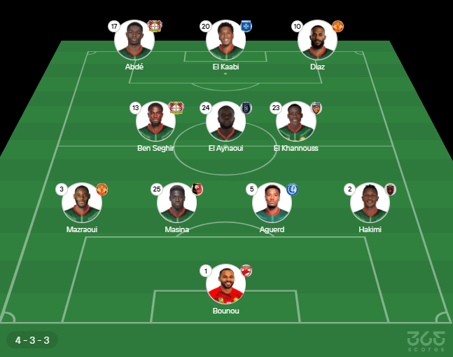 Escalação de Marrocos: Bounou, Hakimi, Aguerd, Masina e Mazraoui; El Khannouss, El Aynaoui e Ben Seghir; Brahim Díaz, Abdé e El Kaabi. Técnico: Walid Regragui.