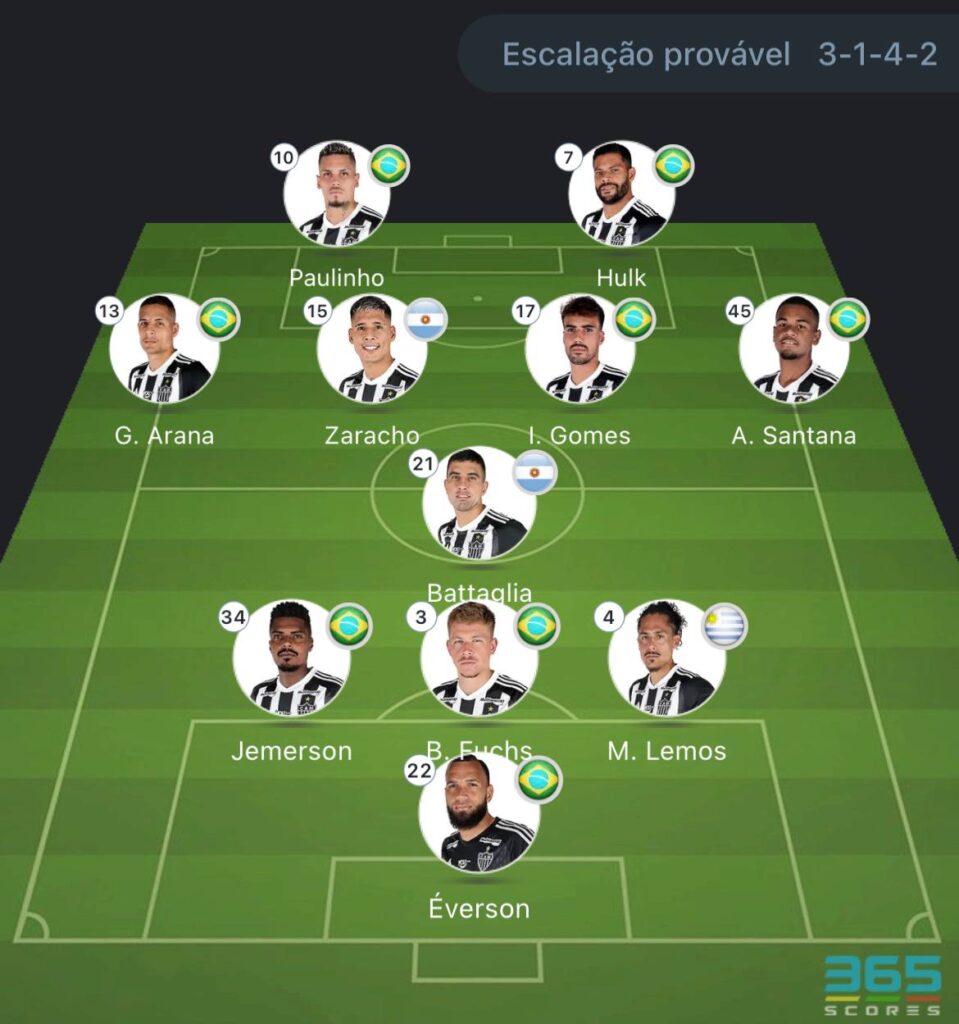 Provável escalação do Atlético-MG: Everson; Jemerson, Lemos, Bruno Fuchs; Battaglia, Zaracho, Igor Gomes, Guilherme Arana, Santana; Paulinho, Hulk