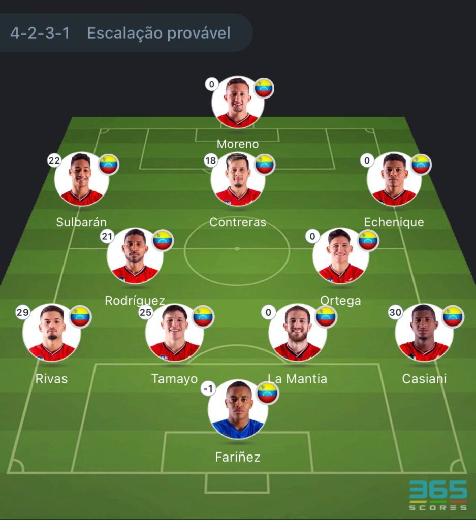 Provável escalação do Caracas: Faríñez; Luis Casiani, La Mantía, Tamayo, Rivas; Vicente Rodríguez, Ortega; Ender Echenique Peña, Contreras, Sulbarán; Moreno.
