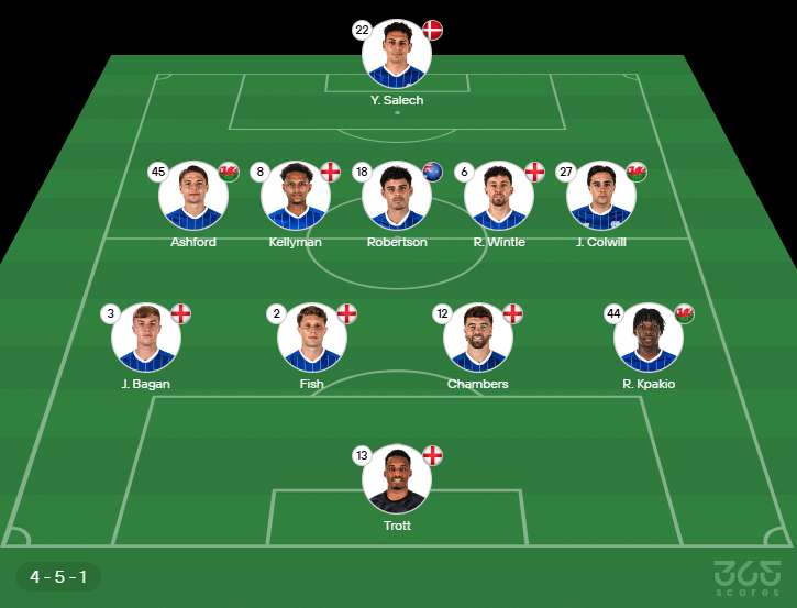 - Escalação do Cardiff City: Trott; Kpakio, Chambers, Fish, Bagan; Colwill, Wintle, Robertson, Kellyman, Ashford; Salech