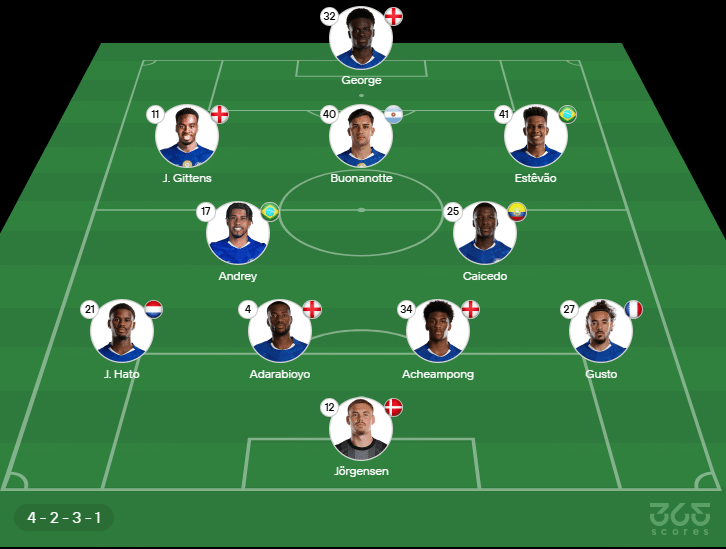 - Escalação do Chelsea: Jörgensen, Gusto, Acheampong, Adarabioyo, Hato; Caicedo, Andrey Santos, Estêvão, Gittens, Buonanotte; George