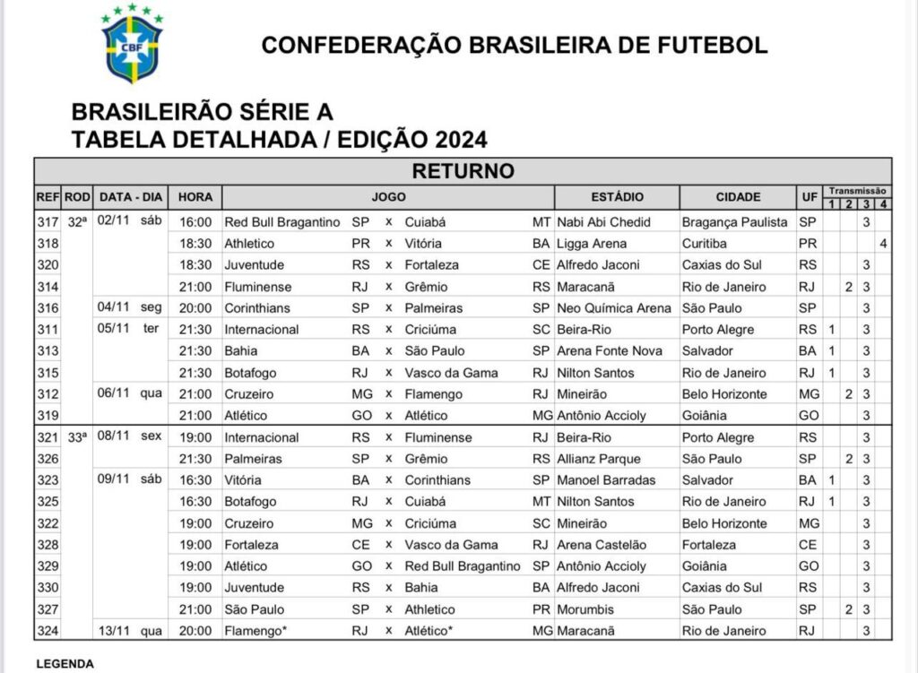A rodada em questão é a 32ª e foi desmembrada de sábado a quarta entre os dias 2 e 6 de novembro. A rodada 33 também irá acontecer em dias diferentes do usual: sexta, sábado e quarta entre 8 e 13 de novembro. A mudança se dá com base na final da Copa do Brasil, que terá jogos nos dias 3 e 10 de novembro.