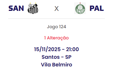 Essa é a única partida atrasada do Santos, enquanto o Palmeiras tem um outro jogo a cumprir. Neste sábado (11), o Verdão recebe o Juventude às 19h (de Brasília), no Allianz Parque, em duelo válido pela 12ª rodada do Brasileirão.