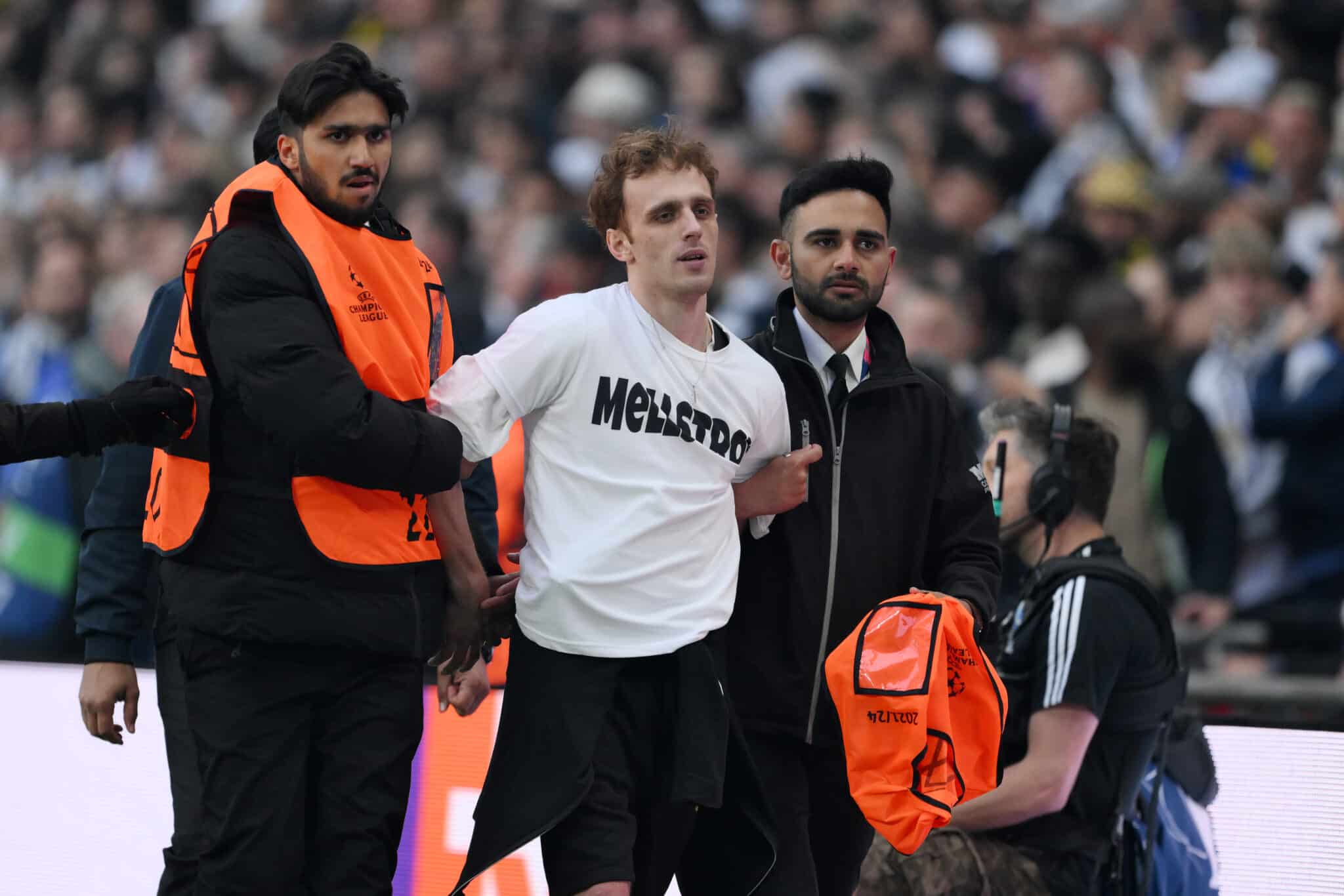 Com menos de um minuto de jogo, a final da Champions League foi interrompida neste sábado (1º), quando torcedores invadiram o gramado. Quatro homens entraram em campo e foram retirados pelos policiais.