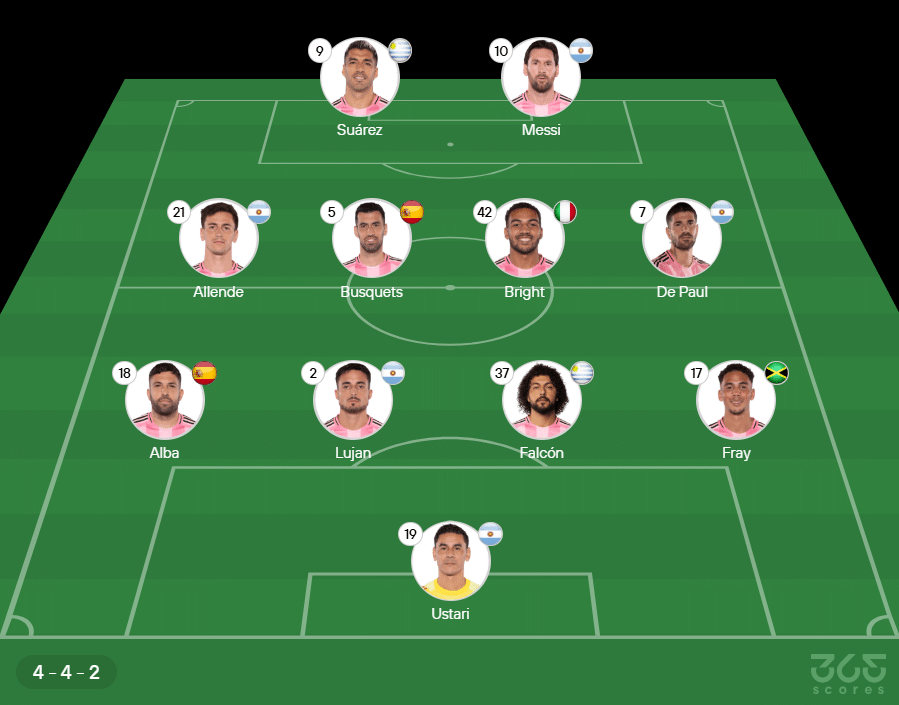 - Provável escalação do Inter Miami: Ustari, Jordi Alba, Lujan, Falcón e Fray; Allende, Sergio Busquets, Bright e Rodrigo De Paul; Luis Suárez e Lionel Messi