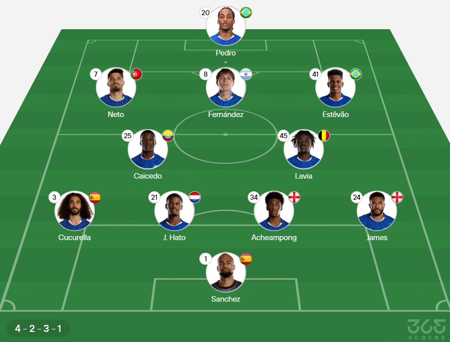 - Provável escalação do Chelsea: Robert Sanchez, Rice James, Ancheampong, Hato e Cucurella; Caicedo e Romeo Lavia; Enzo Fernández, Estêvão e Pedro Neto; João Pedro.