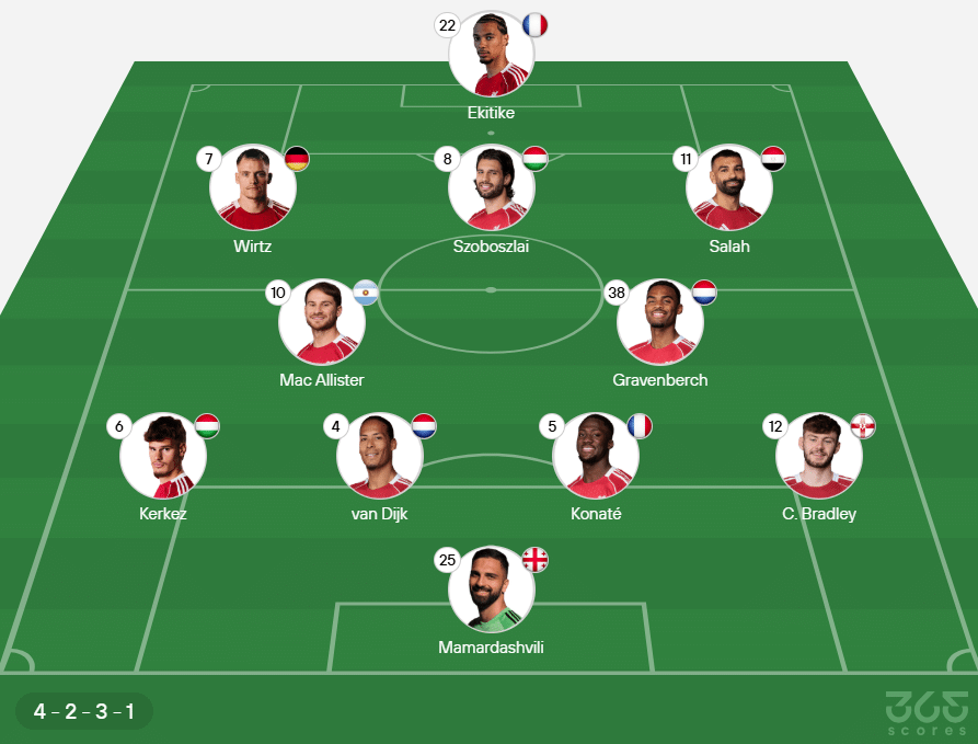 Provável escalação do Liverpool: Mamardashvili; Conor Bradley, Konaté, Virgil van Dijk e Kerkez; Gravenberch e Mac Allister; Szoboszlai, Florian Wirtz e Salah; Ekitike.