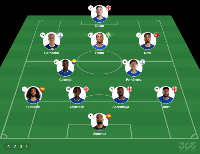Provável escalação do Chelsea: Sanchez; James, Adarabioyo, Chalobah, Cucurella; Fernández, Caicedo, Pedro Neto, Garnacho, João Pedro; Delap. Técnico: Enzo Maresca