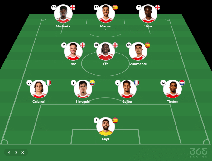 Provável escalação do Arsenal: Raya; Timber, Saliba, Hincapié, Calafiori; Zubimendi, Eze, Rice; Saka, Madueke, Merino. Técnico: Mikel Arteta