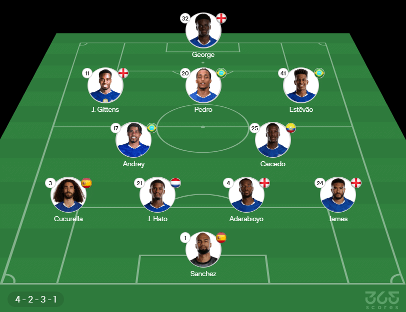 - Provável escalação do Chelsea: Sanchez; Reece James, Adarabioyo, Jorrel Hato e Cucurella; Caicedo e Andrey Santos; Estêvão, João Pedro e Gittens; Tyrique George