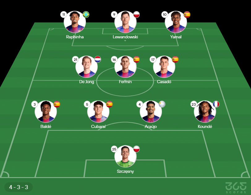 Provável escalação do Barcelona: Szczesny; Koundé, Ronald Araújo, Cubarsí e Baldé; Casadó, Fermín López e De Jong; Lamine Yamal, Lewandowski e Raphinha. Técnico: Hansi Flick.