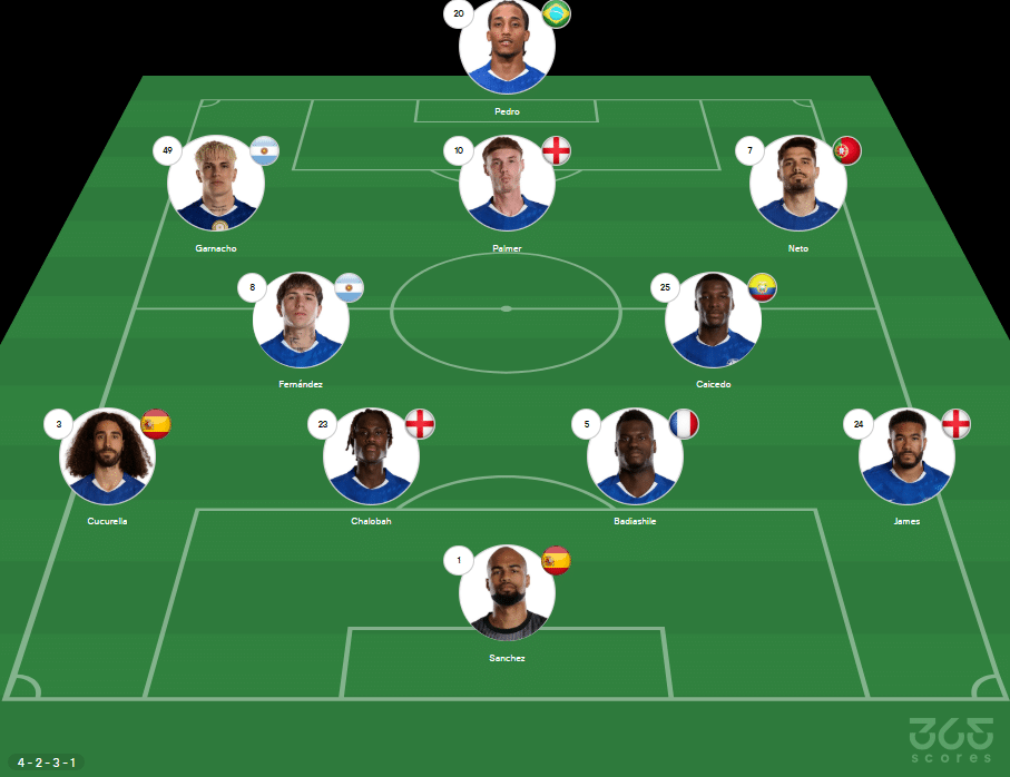 Provável escalação do Chelsea: Sanchez; Reece James, Badiashile, Chalobah e Cucurella Caicedo e Enzo Fernández; Pedro Neto, Cole Palmer e Garnacho; João Pedro. Técnico: Enzo Mareca.
