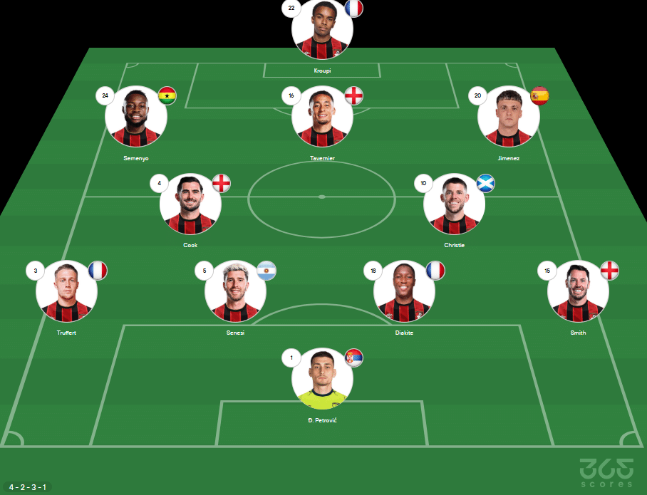 - Provável escalação do Bournemouth: Petrovic; Smith, Diakite, Senesi e Truffert; Christie e Cook; Jimenez, Tavernier e Semenyo; Kroupi