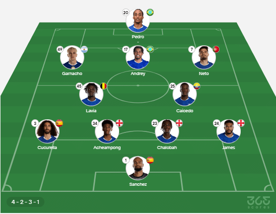 Provável escalação do Chelsea: Sanchez, James, Chalobah, Acheampong, Cucurella; Caicedo, Lavio, Neto, Garnacho, Andrey Santos; João Pedro. Técnico: Enzo Maresca