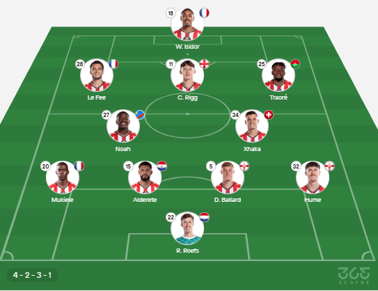 Provável escalação do Sunderland: Roefs, Hume, Ballard, Alderete, Mukiele; Xhaka, Noah, Traoré, Le Fee, Rigg; Isidor. Técnico: Régis Le Bris