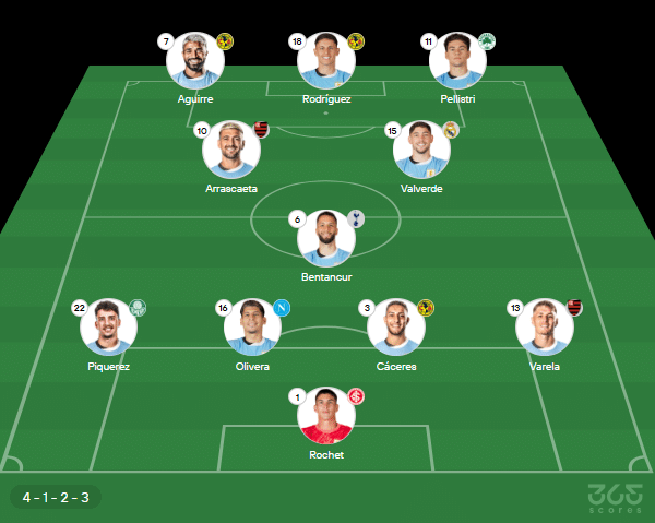 - Provável escalação do Uruguai: Rochet; Varela, Cáceres, Olivera, Piquerez; Bentancur, Valverde, Arrascaeta; Pelistri, Aguirre, Rodríguez