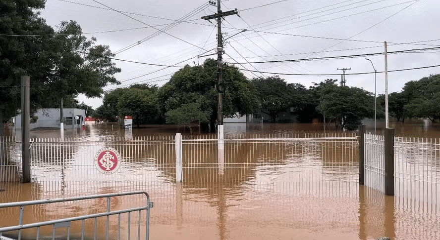 O rival também tem sofrido com os temporais. O Centro de Treinamento Luiz Carvalho, do Grêmio também sofreu com os efeitos. A água atingiu o complexo gremista e inundou completamente a Rua João Moreira Maciel, onde fica a entrada do local.