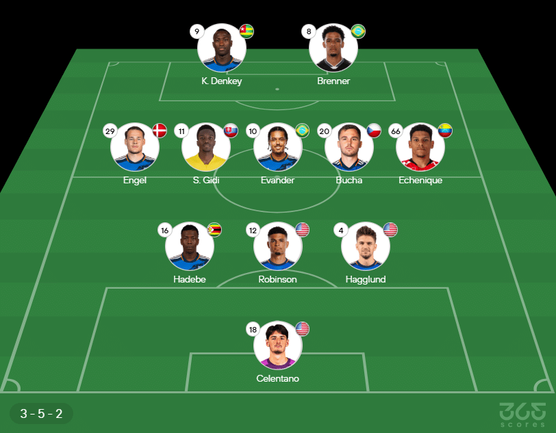 - Provável escalação do Cincinnati: Celentano; Hagglund, Robinson e Hadede; Echenique, Bucha, Evander, Gidi e Engel; Brenner e Denkey