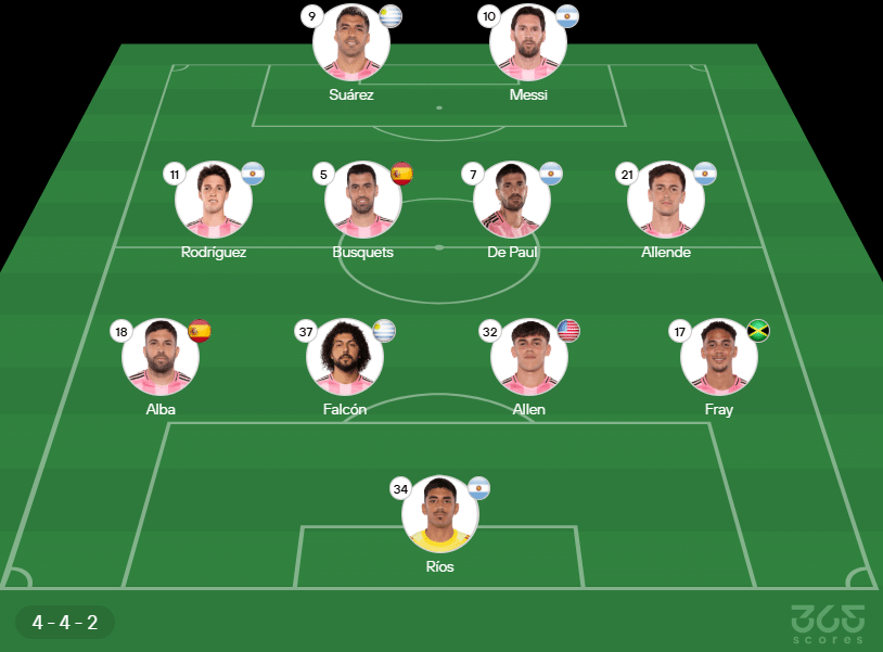 Provável escalação do Inter Miami: Ríos; Ian Fray, Noah Allen, Falcón e Jordi Alba; Tadeo Allende, De Paul, Sergio Busquets e Rodríguez; Lionel Messi e Luis Suárez. Técnico: Javier Mascherano.