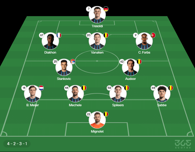 - Provável escalação do Club Brugge: Mignolet; Meijer, Mechele, Spileers e Sabbe; Stankovic, Audoor e Vanaken; Diakhon, Forbs e Tresoldi