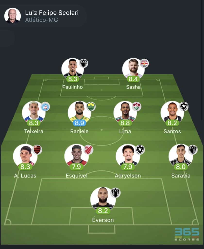 No gol, está Éverson, do Atlético-MG, com 8.2. Sua equipe derrotou o Palmeiras por 2 a 0, em pleno Allianz Parque, na quinta. Além dele, o lateral-direito Saravia, com 8.0, e o atacante Paulinho, com 8.3, aparecem. Felipão é o treinador escolhido.