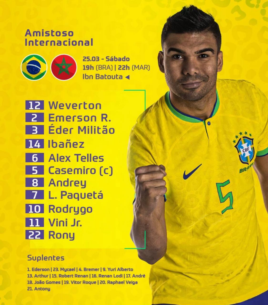 A seleção brasileira está escalada para encarar o Marrocos, neste sábado, às 19h (de Brasília), na cidade de Tânger, no norte do Marrocos, em seu primeiro desafio depois da eliminação nas quartas de final da Copa do Mundo do Catar e da saída do técnico Tite, que ficou seis anos à frente da equipe.