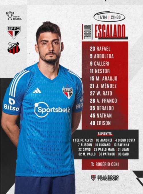 O São Paulo está escalado para a estreia na Copa do Brasil. A equipe comandada por Rogério Ceni terá o retorno de Calleri e Diego Costa. Ambos os atletas se recuperaram de lesão e estão à disposição do treinador.