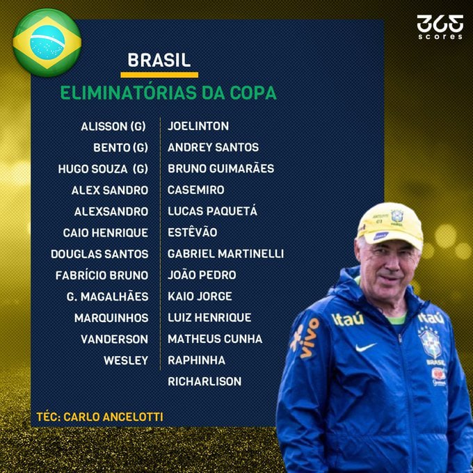 O técnico Carlo Ancelotti anunciou nesta segunda-feira (dia 26) os convocados da seleção brasileira para os dois últimos jogos das Eliminatórias da Copa do Mundo, contra Chile e Bolívia. O Brasil já está classificado.