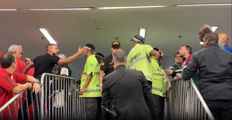 Em vídeos que circulam pelas redes sociais, é possível ver a confusão já estabelecida entre o presidente Tricolor, Mário Bittencourt, e Diogo Lemos, membro do conselho Rubro-Negro.