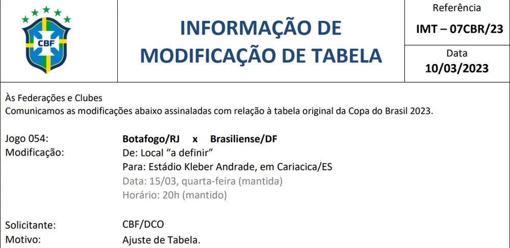 A partida entre Botafogo e Brasiliense, pela segunda fase da Copa do Brasil, será disputada em Cariacica, no Espírito Santo. O duelo está marcado para a próxima quarta-feira, às 20h.