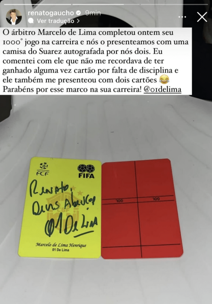 Um dos motivos que fazem o Timão reprovar a escolha de Marcelo de Lima Henrique é uma suposta proximidade que ele tem com o técnico Renato Gaúcho, da equipe adversária. Isso porque, ano passado, ambos trocaram presentes, e o comandante do Tricolor enviou uma camisa de Luís Suárez, e em troca, recebeu cartões autografados. Veja abaixo: