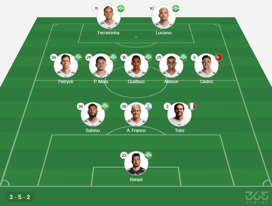 - Provável escalação do São Paulo: Rafael; Alan Franco, Ferraresi, Sabino; Maik, Bobadilla, Alisson, Gustavo, Patryck; Luciano, Ferreirinha