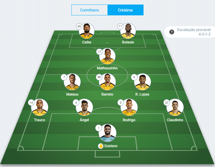 Provável escalação do Criciúma: Gustavo, Claudinho, Rodrigo, Ángel e Trauco; Ronald Lopes, Barreto e Mateus; Matheusinho; Bolasie e Caike.