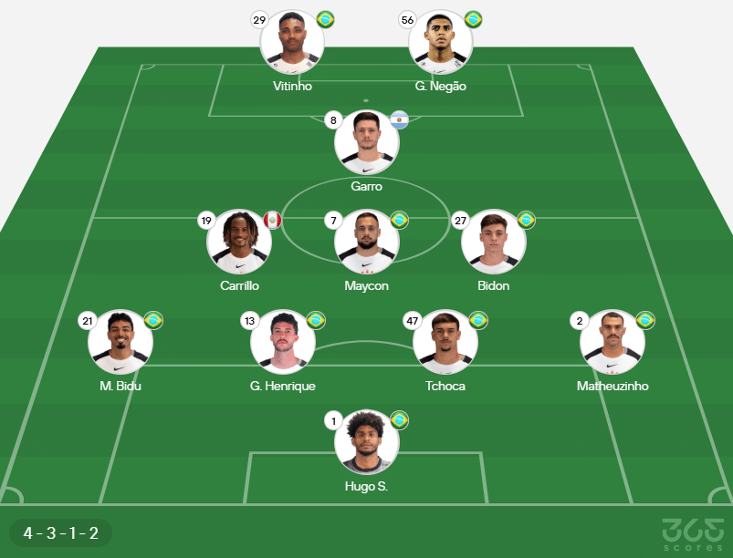 Escalação do Corinthians: Hugo Souza; Matheuzinho, Tchoca, Gustavo Henrique e Matheus Bidu; Maycon, André Carillo e Breno Bidon; Rodrigo Garro (Dieguinho); Vitinho e Gui Negão.