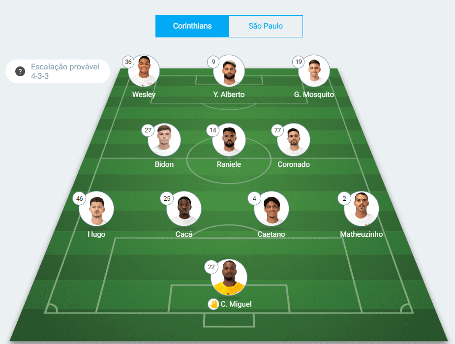 Provável escalação do Timão: Carlos Miguel, Matheuzinho, Caetano, Cacá, Hugo, Coronado, Raniele, Bidon, Mosquito, Wesley e Yuri Alberto.