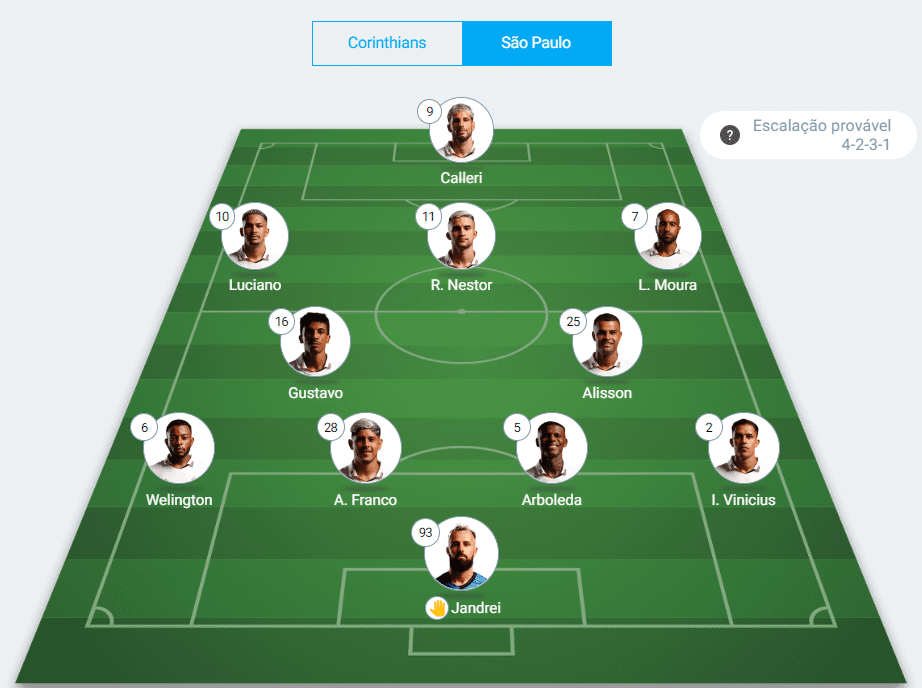 - Escalação do São Paulo: Jandrei, I. Vinicius, Arboleda, A. Franco, Wellington, Alisson, Gustavo, Lucas, Nestor, Luciano e Calleri.