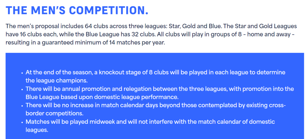 A nova proposta da Superliga levaria em conta 64 clubes divididos entre três divisões (Star e Gold, com 16 equipes, e Blue, com 32). Os grupos seriam de oito equipes que se enfrentam em turno e returno, totalizando ao menos 14 partidas por equipe, e oito se classificando para o mata-mata. O acesso à liga Blue ocorreria via ligas nacionais.