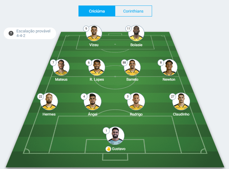 - Provável escalação do Criciúma: Gustavo; Claudinho, Rodrigo, Ángel, Hermes; Newton, Barreto, R. Lopes, Mateus; Bolasie e Vizeu